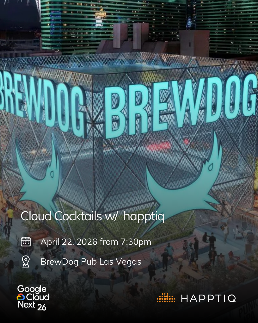 Google Next'26 day over? Keep the conversation flowing at happtiq's "Cloud Cocktails" on BrewDog's terrace. Enjoy relaxed networking and drinks with our team and fellow attendees. Limited spots – RSVP now!